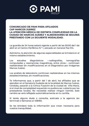 PAMI modifica la atención médica en Marcos Juárez: cómo será desde el 1 de abril