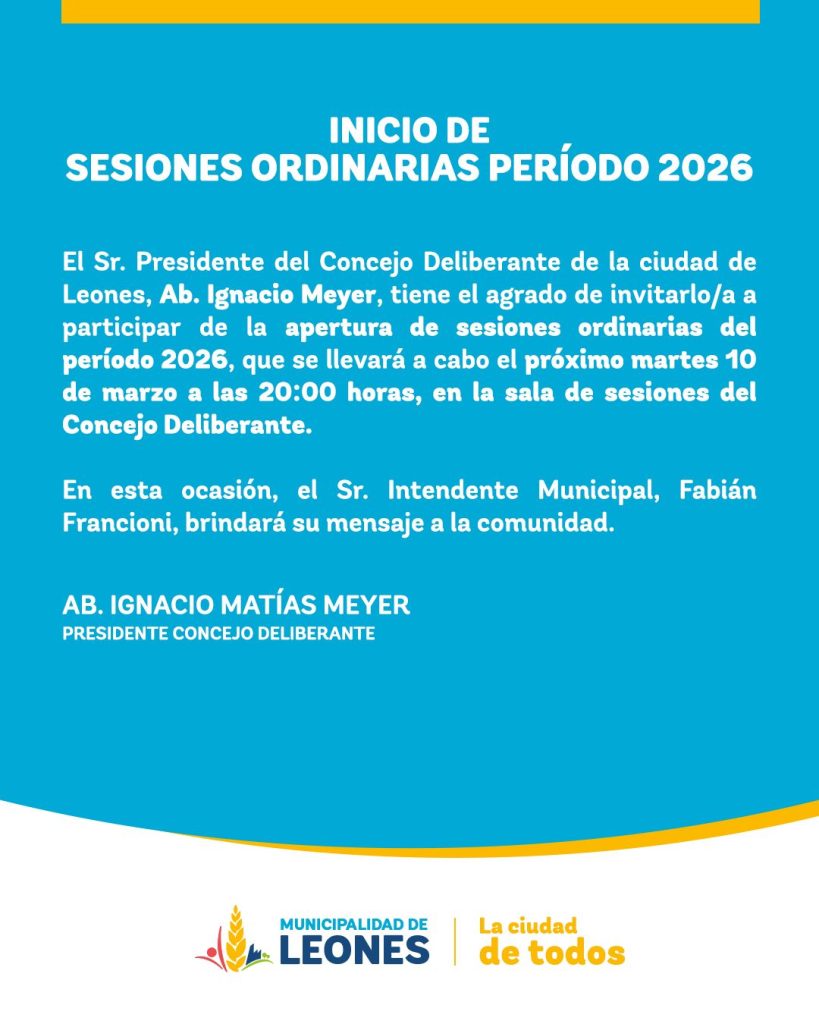 La ciudad de Leones, en el sudeste de Córdoba, dará inicio al período legislativo 2026 con la apertura de sesiones ordinarias del Concejo Deliberante, un acto institucional que convoca a autoridades, instituciones y vecinos de la comunidad.