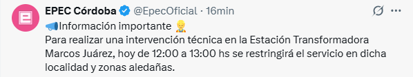 La interrupción está prevista entre las 12:00 y las 13:00 hs, y durante ese lapso se verá afectado el suministro en Marcos Juárez y zonas aledañas.