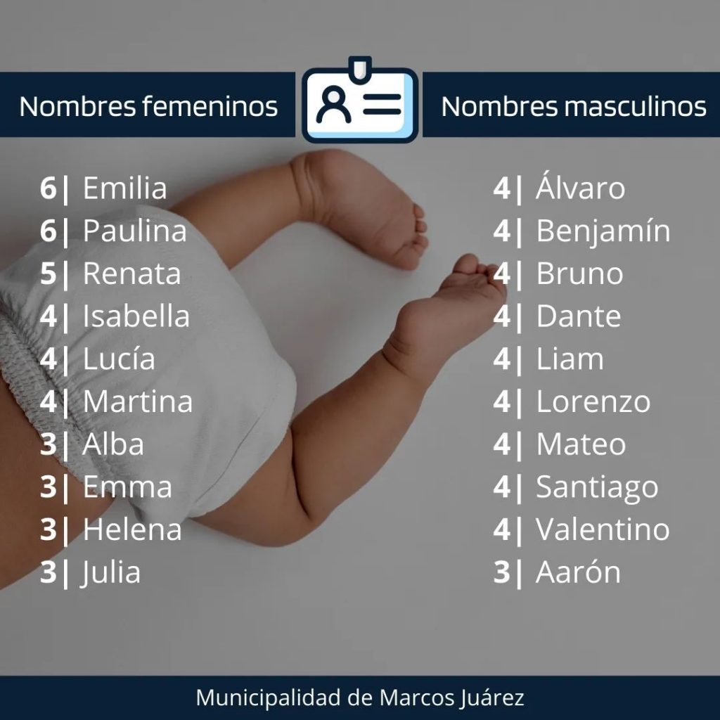 El registro civil de la ciudad de Marcos Juárez informó sobre los nombres más elegidos durante el año 2022 en la ciudad.