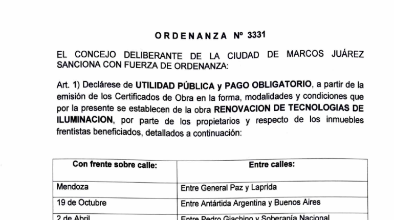 Obras de alumbrado en Marcos Juárez: así es la notificación y los montos a pagar