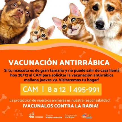 El día jueves 29 de diciembre el equipo de Bromatología Municipal estará visitando los hogares de aquellas personas que tengas mascotas que no puedan ser acercados hasta el centro de vacunación. Para ello deberán llamar telefónicamente al CAM, dando aviso de la dirección. No desaprovechar esta importante oportunidad de cuidar a las mascotas.