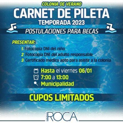 Desde el área de acción social convocan a niños y niñas de 5 a 12 años para postularse en las becas de la Colonia de verano del Centro Deportivo General Roca . ¡Hay tiempo hasta el 6/01!