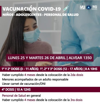 Este es el esquema de vacunación covid-19 en la ciudad de Marcos Juárez en la semana que comprende los días 25 al 29 de abril. Lunes 25 y martes 26 8 a 10hs Niños – Adolescentes 1ra y 2da (3 a 11 años) – 1ra, 2da y 3ra (12 a 17 años) 10 a 12hs […]