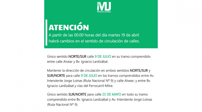 Desde las 00 hs del día 19 de abril las calles 9 de Julio y 25 de Mayo la municipalidad de Marcos Juárez implementó el cambio del sentido de estas arterias. Calle 9 de Julio modificará su dirección desde norte a sur en el tramo comprendido entre calle Alvear y Lardizábal. Mantendrá la circulación en […]