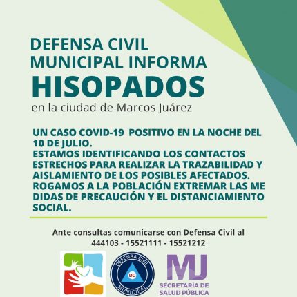 Se confirma a través de la comunicación oficial de la Municipalidad de Marcos Juárez de un nuevo caso Covid_19 en la ciudad durante la noche del 10 de Julio. En este momento se está trabajando sobre la identificación de contactos estrechos para realizar la trazabilidad y aislamiento de los posibles afectados. Un caso + #COVID__19 […]