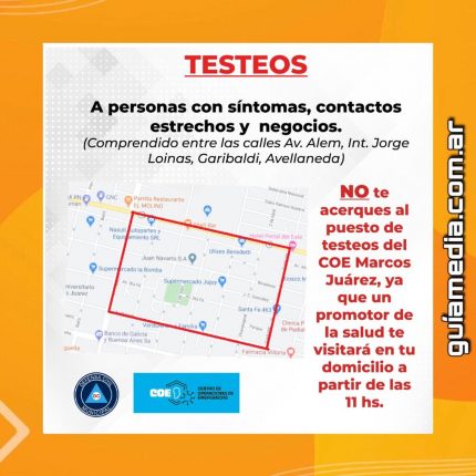 Comienzan los testeos en campo para quiénes vivan en los sectores comprendidos NO ❌deben acercarse al puesto🚑, personal médico 👨🔬 visitará los domicilios a quienes estén con síntomas, contactos estrechos o tengan negocios. 🦠Atención muy importante😷 Comienzan los testeos en campo. Para quiénes vivan en los sectores comprendidos no deben acercarse al puesto, personal médico […]