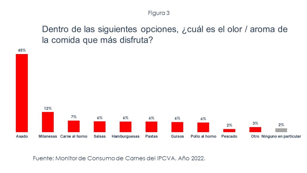 Cuando se indaga por la preferencia de olores entre distintas comidas, el asado le saca varios cuerpos de ventaja a otras opciones de carnes, como el pollo o pescado, e incluso hasta las pastas. Esto, al menos desde el punto de vista olfativo, deja bien en claro quién gana la batalla de los domingos. Mientras que un 45% de las respuestas mencionan como olor predilecto al asado, sólo un 6% se inclina por las pastas (Ver figura 3).