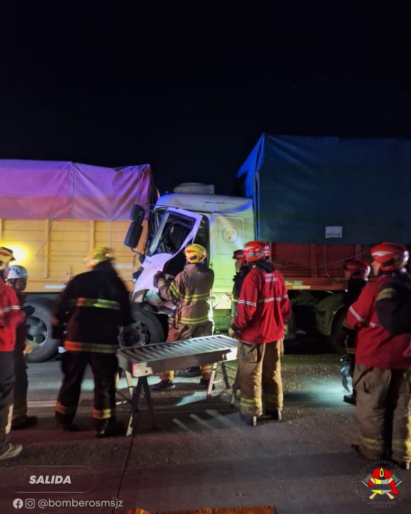 Bomberos voluntarios debieron emplear herramientas especiales para poder liberar al chofer, que posteriormente fue trasladado al hospital para su atención médica. El conductor del otro camión involucrado salió ileso y no necesitó asistencia.