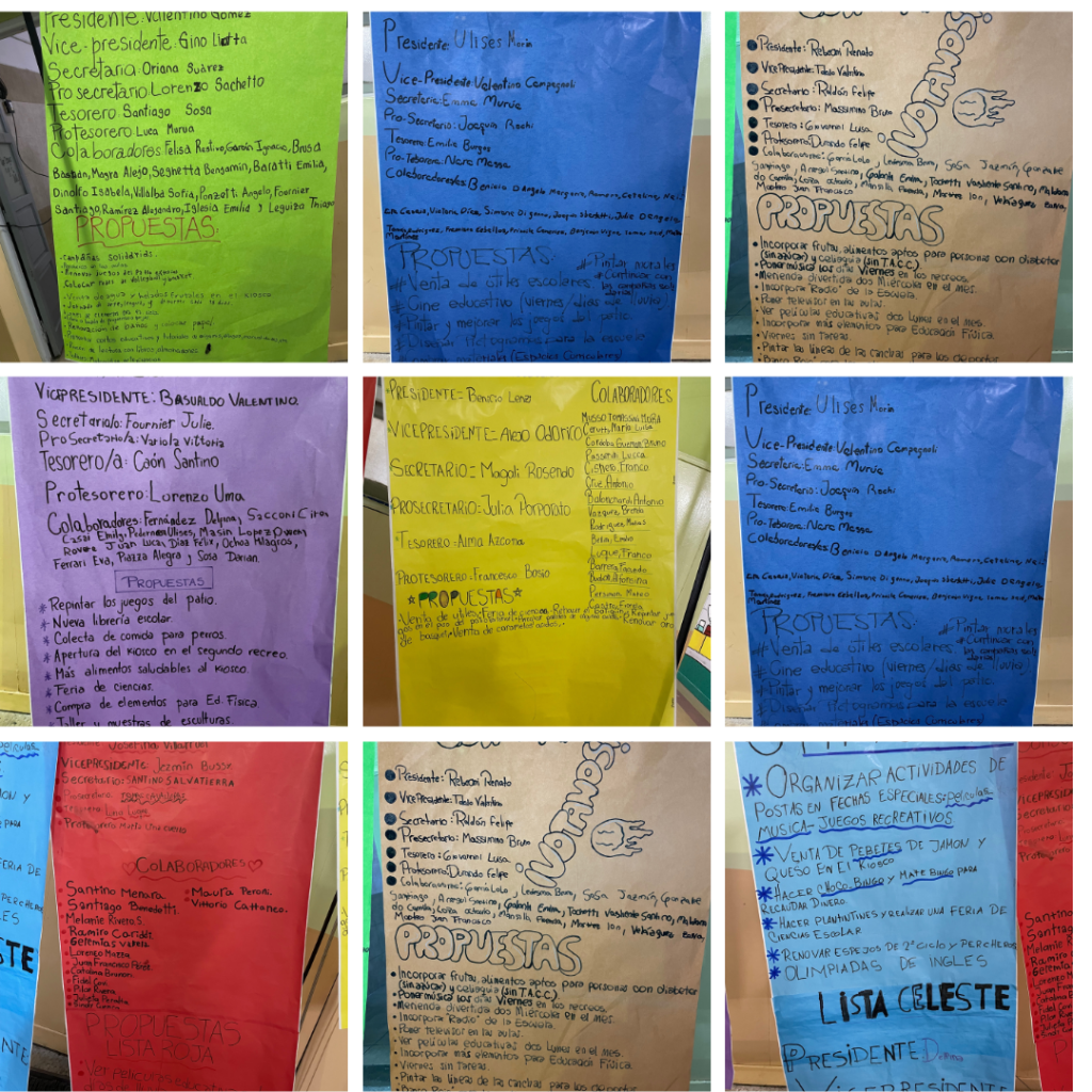 En las instalaciones de la escuela, los afiches de colores llamaban la atención de los votantes, mostrando las distintas propuestas de cada una de las listas. Entre las opciones disponibles figuraban la lista naranja, azul, violeta, celeste, roja y amarilla, cada una con su propio plan para mejorar la experiencia educativa y el bienestar de los estudiantes.