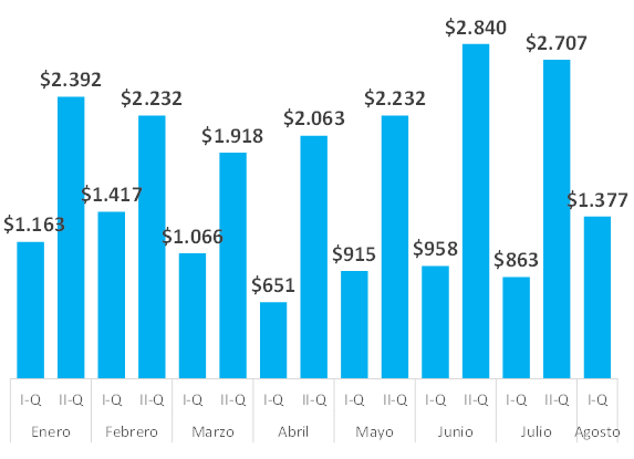 Comparando con igual quincena del 2019 y 2018, descontada la inflación al mes de julio, los ingresos que recibirán municipios y comunas por la primera quincena de agosto significarán una caída del 3,4% respecto a lo recibido en 2019 y un incremento del 2,1% respecto a lo recibido en igual quincena del año 2018.