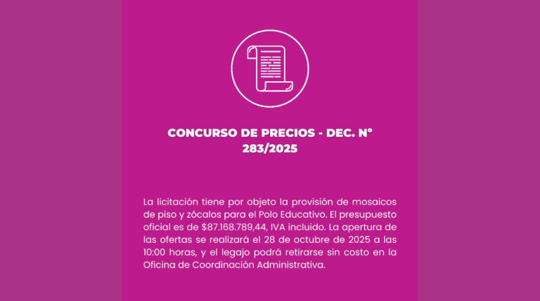 La Municipalidad de Marcos Juárez lanzó un Concurso de Precios (Decreto Nº 283/2025) con el objetivo de contratar la provisión de mosaicos de piso y zócalos destinados al Polo Educativo, una de las obras públicas más relevantes que impulsa la ciudad en materia de infraestructura educativa. El presupuesto oficial asignado para esta contratación asciende a […]