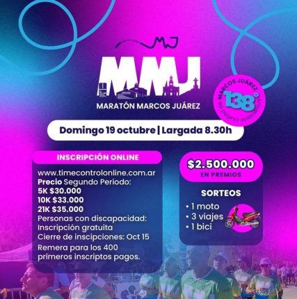 El próximo domingo 19 de octubre a las 8:30 h, el Parque Lago Henry Dellarossa será el punto de partida de una nueva edición de la Maratón de Marcos Juárez 2025, una cita que promete reunir a corredores, familias y amantes del deporte en una mañana llena de energía, premios y celebración. 🎉 Una carrera […]