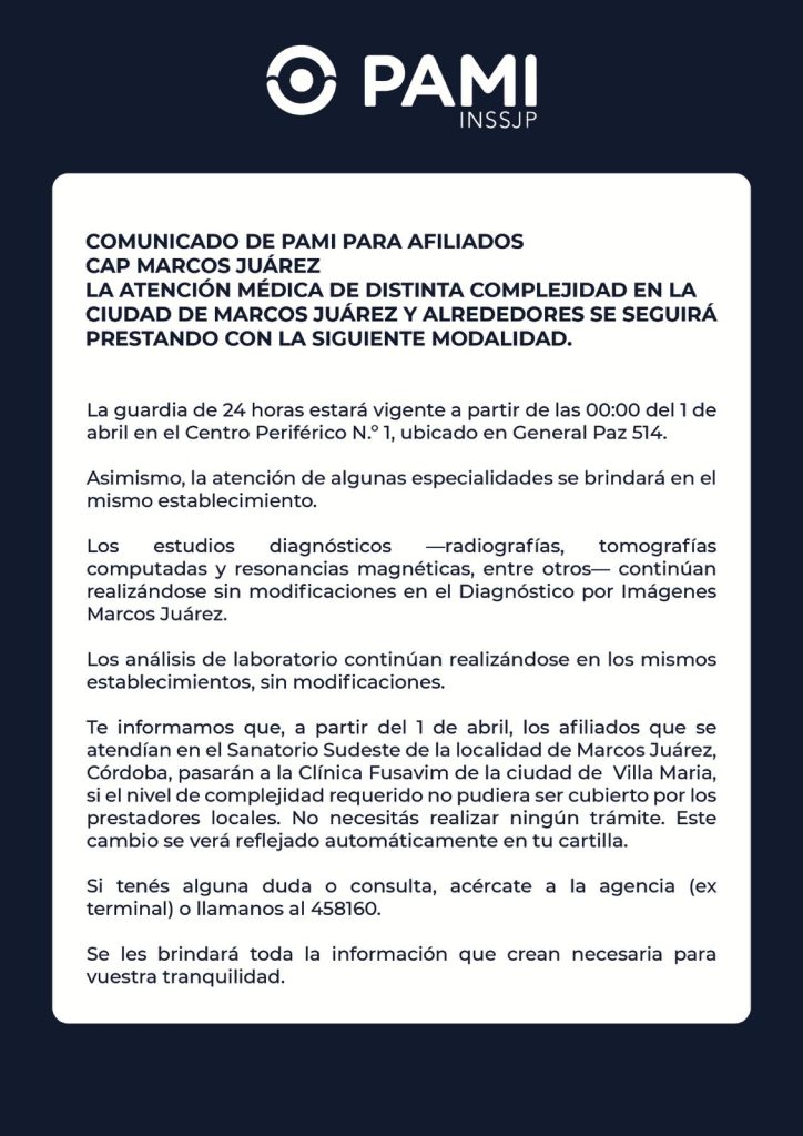 El PAMI informó cambios en la modalidad de atención médica para afiliados en Marcos Juárez y la región, los cuales comenzarán a regir desde el 1 de abril.